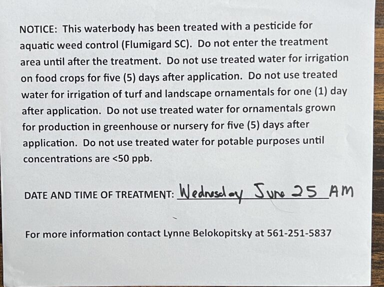 Our lake treatment is scheduled for the morning of Wednesday, June 25. The attached notification will be posted at public access sites and on our KLCA bulletin boards.